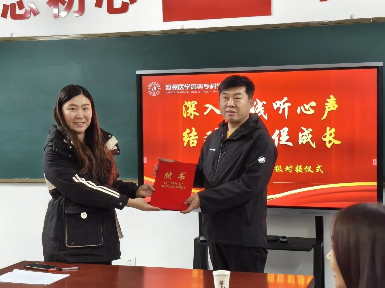 口腔系辅导员老师王苗苗详细介绍了对接班级的基本情况。曾会平同学代表全体学生做了热情洋溢的表态发言。现场还向出席活动的各位导师颁发了聘任证书。