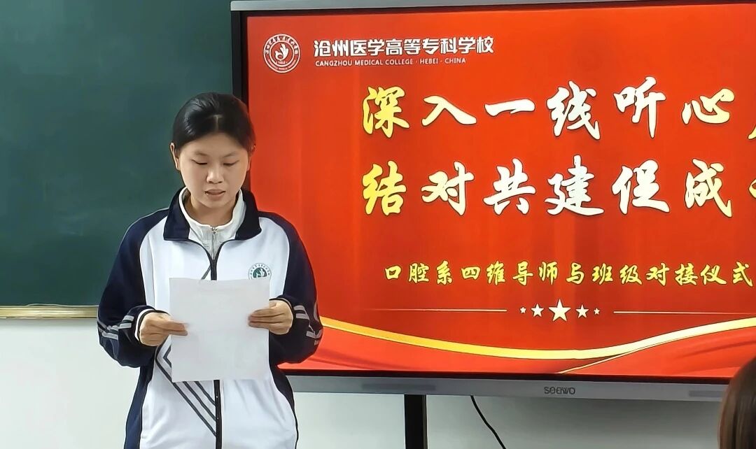 活动伊始,口腔系党总支负责人首先宣读了《中共沧州医学高等专科学校委员会领导干部联系班级制度》及对接安排情况,阐明了本次活动的意义、目的。本次“四维聚力,筑梦启航”活动由学工部副部长李园园老师、口腔系班子成员、辅导员老师及口腔医学专业2025级1班学生代表30余人参与本次活动。