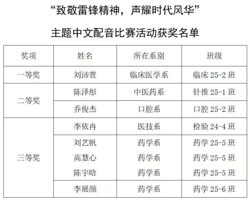 评选已圆满落幕,在本次声音展演中,同学们以声音为火炬,用热忱与敬意传承雷锋精神,展现了深厚的家国情怀与旱扬的青春风貌。经评委严運评审,综合投票后,最络评选出一,二,三等奖及优秀奖,获奖名单如下: