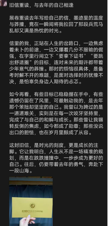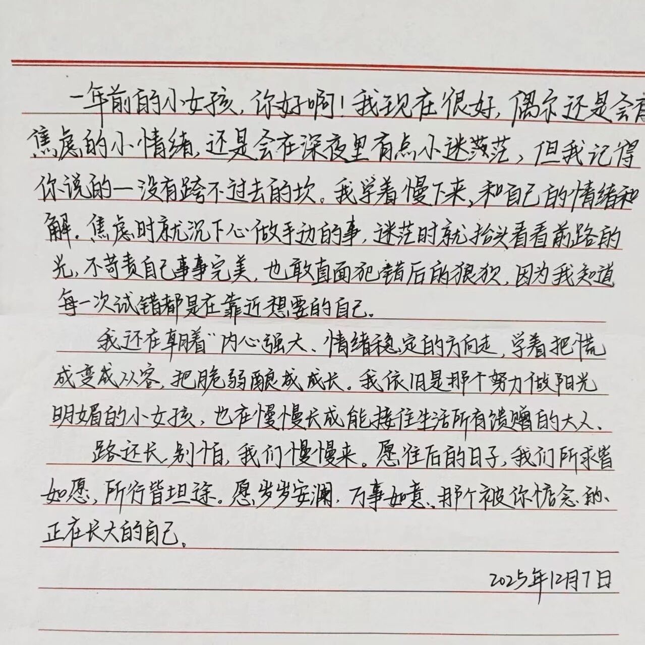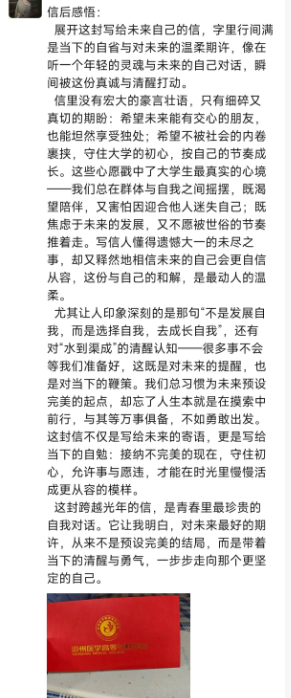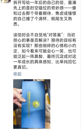 这封 “时光慢递”,不仅是一封写给未来的信,更是一次与自己的对话。它让我们在忙碌的大学生活中,停下脚步,回望初心;它让我们在成长的旅程中,记住那些纯粹的热爱与坚定的信念。一年的时光,足以让我们褪去青涩,收获成长;而这封信,则成为了青春里最温暖的注脚,见证着我们每一次的蜕变与进步。
