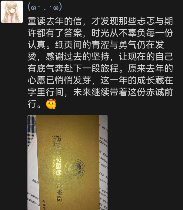 感谢每一位参与活动的同学,是你们的真诚与期许,让时光有了别样的意义。也愿我们都能带着这份来自过去的鼓励,在未来的日子里,继续勇敢前行,活成自己喜欢的模样。 或许下一次,我们还会相约 “时光慢递”,把更多的期待与憧憬,写给更远的未来。而此刻,就让我们带着这份感动与力量,珍惜当下,不负韶华,在青春的赛道上,奋力奔跑!