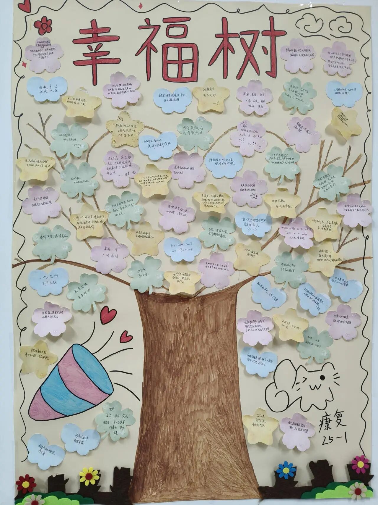 此次活动以创意拼贴为载体,让同学们主动放慢脚步,发现并记录集体生活中的微小幸福。那些曾经被忽略的瞬间,在创作与分享中被重新珍视;个体的积极情绪,也在集体共创中汇聚成强大的心理能量。“幸福树”不仅是一幅创意作品,更成为凝聚班级力量、提升归属感的精神纽带。
