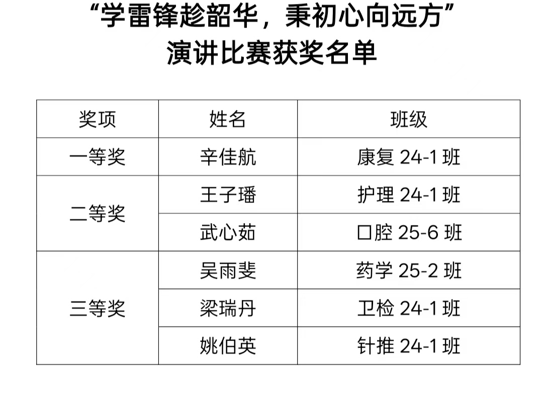 评选已然落下帷幕,本次演讲比赛中同学们深刻领会雷锋精神的时代内涵,以实际行动践行初心,展现同学们的知善行善、担当作为的精神。经校团委组织部严格评审,在全部参赛同学中,共评选出六名优胜学生。获奖名单如下: