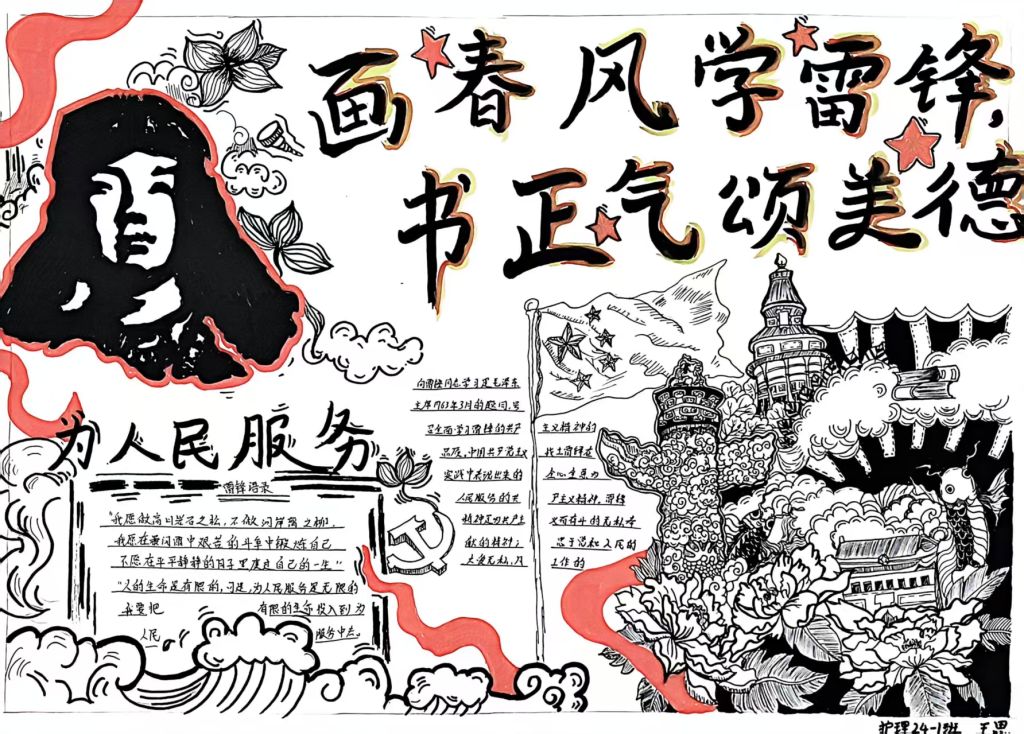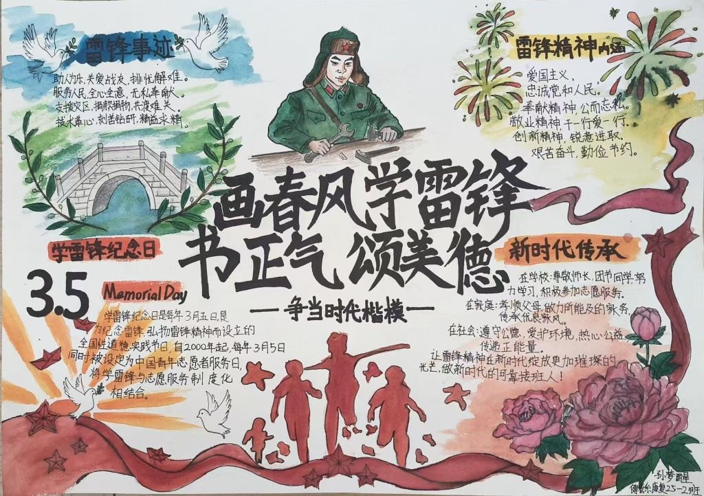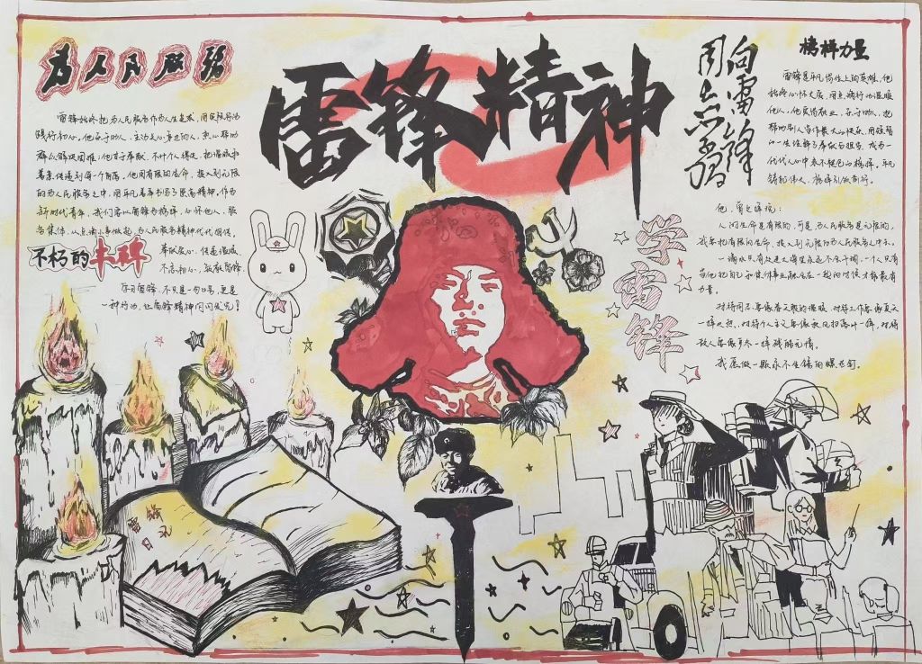 雷锋精神以无私奉献、爱岗敬业、助人为乐为核心,凝聚着中华民族的传统美德,是新时代青年砥砺初心、涵养品格的精神灯塔。为深入弘扬雷锋精神,引导同学们在创作与实践中感悟奉献之美、传承美德基因,进一步营造向上向善、互助友爱的校园文化氛围,激发同学们的创作热情与责任担当,我校特举办以“画春风学雷锋,书正气颂美德”为主题的手抄报比赛活动。